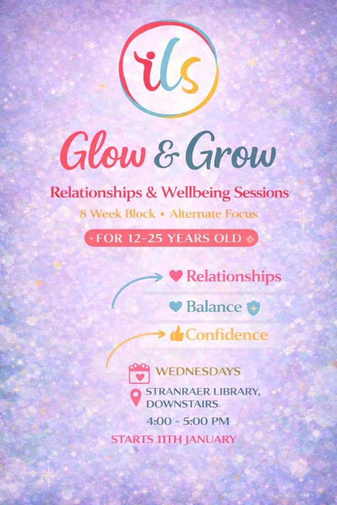 Do you live in #Stranraer? Female aged 12-25? Would like a safe space to talk about relationships and learn some new healthier wellbeing tips & skills to boost your confidence? Why not join our new ILS group… created by you for you… this ILS group will be run on Wednesdays at Stranraer library 4-5pm.